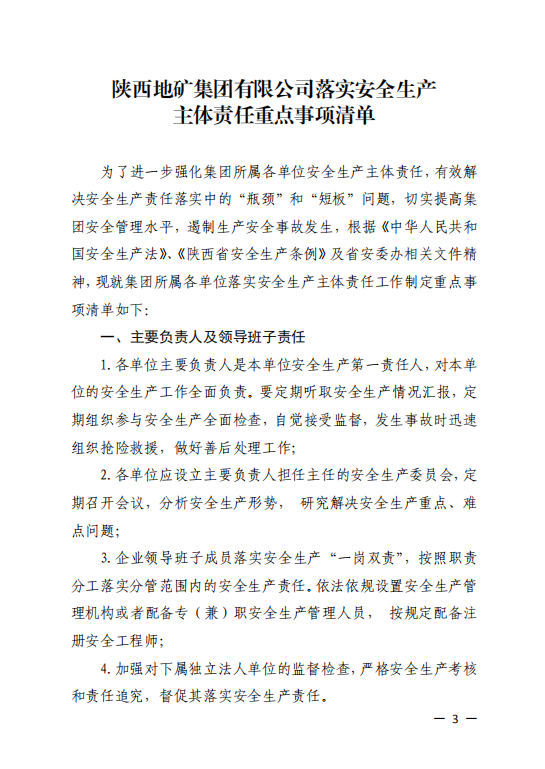 关于印发《陕西地矿集团有限公司落实安全生产主体责任重点事项清单》的通知